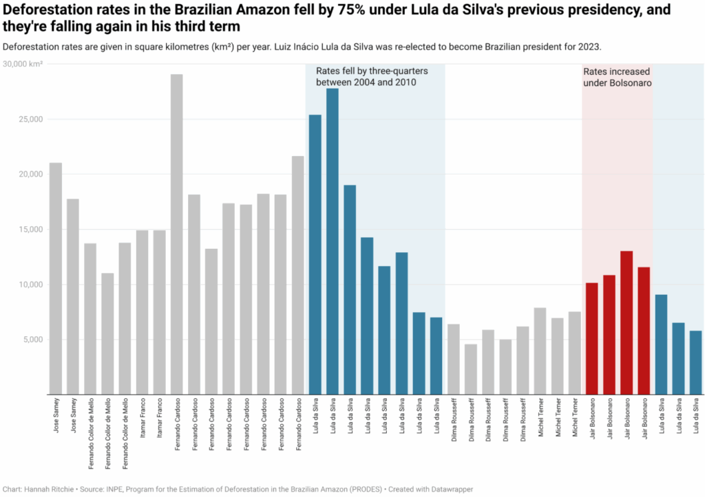 Die nächste Klima-Good News bringt uns nach Brasilien. Unter Präsident Lula da Silva ist die Abholzung des Amazonas-Regenwaldes erneut gesunken. 2025 war die Abholzungsrate so niedrig wie zuletzt 2014. In dieser Grafik siehst du, wie viele Quadratkilometer Regenwald pro Jahr abgeholzt wurden und unter welchem Präsidenten. Unter Jair Bolsonaro, Ex-Präsident und erst kürzlich zu mehr als 27 Jahren Haft wegen eines versuchten Putsches verurteilt, ging die Abholzung nach oben.
