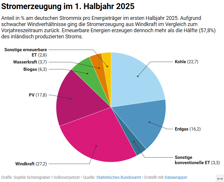 4. Erstes Halbjahr 2025: Erstmals mehr Strom aus Erneuerbaren als aus Kohle