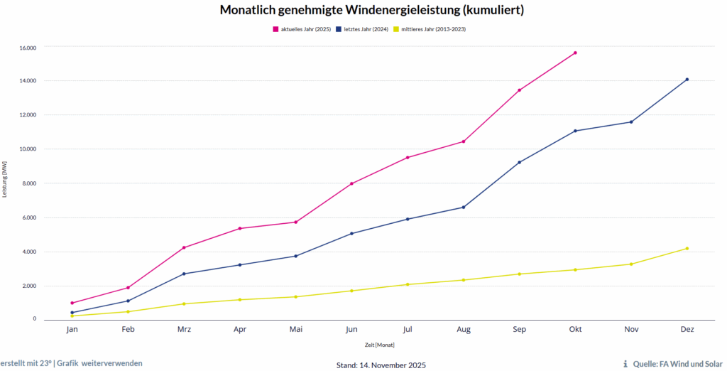 Nachdem der Windenergieausbau vor 2023 massiv eingebrochen war, erlebte er ab 2023 neuen Aufschwung. Während zwar schon seit längerem jedes Jahr mehr Windenergieleistung genehmigt wurde, wurde 2024 “erstmals ein Niveau erreicht, das ein Erreichen künftiger Ausbaupfade nach dem EEG realistisch werden lässt”, wie die Fachagentur Wind und Solar schreibt. Und dieses Jahr scheint erneut ein Spitzenjahr zu werden. Wie du in der Grafik siehst, wurde dieses Jahr (pinke Linie) bisher in jedem Monat mehr kumulierte Leistung genehmigt als im selben Monat 2024.