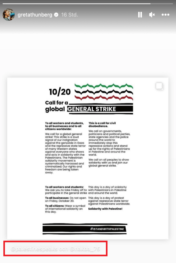 Greta Thunberg solidarisiert sich auf verschiedenen Instagram-Posts mit Palästina und spricht sich für eine zwei Staaten Lösung aus. Das ist natürlich grundsätzlich ihr Recht. Sachliche und faktisch fundierte Kritik am militärischen Vorgehen oder Aussagen von israelischen Offiziellen ist nicht verboten. Greta Thunberg hat aber bisher bedauerlicherweise mit keinem Wort die Massaker am 7. Oktober an über tausend unschuldigen Zivilisten in Israel durch die Terrororganisation Hamas verurteilt. Vor diesem Hintergrund ist das bereits problematisch.
