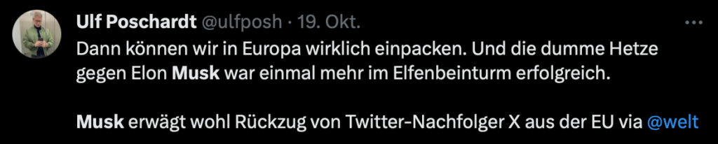 P.S.: Die Beiträge werden natürlich auch von den Medien des Axel-Springer-Verlags zur Kritik an „Linken“ und „Grünen“ genutzt und Greta Thumberg zu Recht kritisiert. Es entbehrt jedoch nicht einer gewissen Doppelmoral, dass der Verlag, der hier Antisemitismus sehen und verurteilen kann, sonst gerne mal auf dem rechten Auge blind ist. Der WELT-Chef leugnet und relativiert offenbar sehr gerne die Vorwürfe gegen Elon Musk als „dumme Hetze“, der Antisemitismus auf seiner Plattform zulässt und selber deutlich verbreitet. Die Hamas freut sich. Die kann dank wohl Elon Musk ihre Propaganda auf Twitter verbreiten.