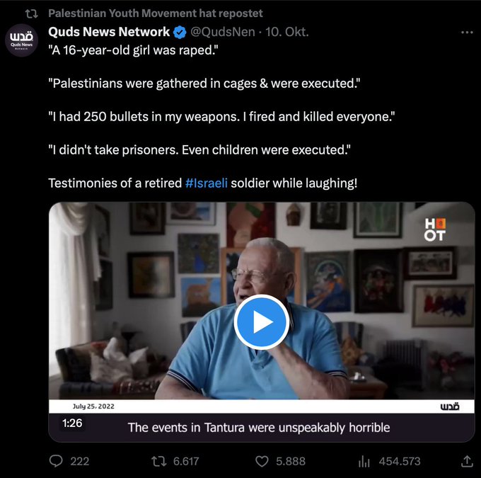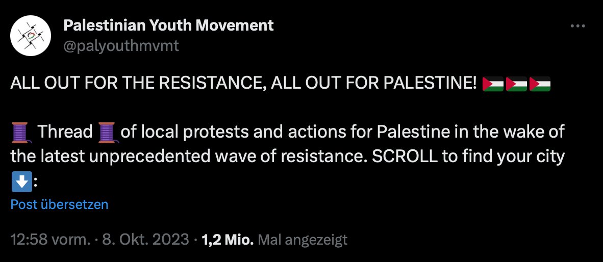Zur Erinnerung: Das wurde einen Tag nach dem Massaker an 1200 unschuldigen Israelis gepostet. Diese Organisation setzt sich dafür ein, dass Morde an Zivilist:innen als „Widerstand“ verharmlost werden sollen. Das hat nichts mehr mit Einsatz für den Frieden zu tun. Buchstäblich mit dem Gegenteil davon.