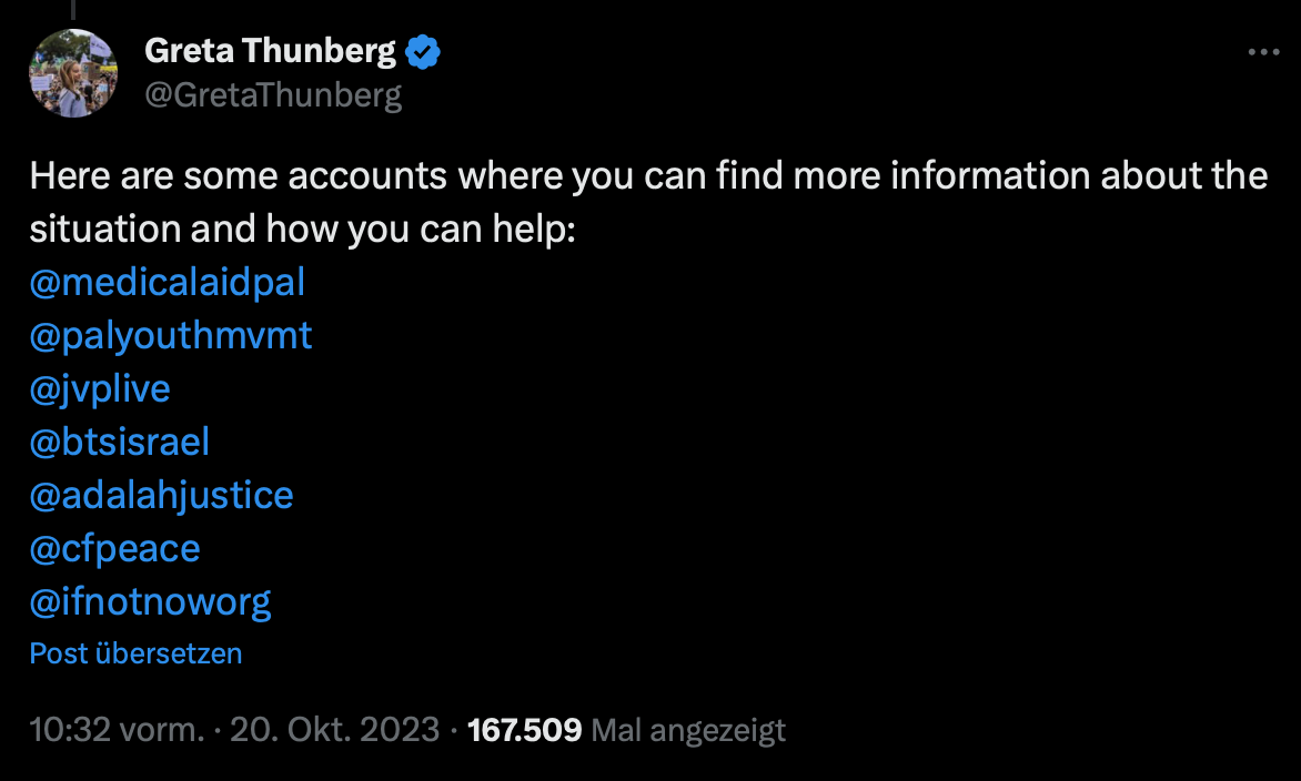 Sie empfiehlt aber nun zusätzlich auch mehrere Accounts, die extrem problematisch sind und Terrorismus nicht ablehnen. Das überschreitet klar eine Grenze. Egal wie es am Ende in Nahost zu Frieden kommt, eines ist klar: Es wird nicht durch Terrorismus und Morde an Zivilisten zu Frieden kommen. Problematisch sind insbesondere die Accounts „palestinespeaks“, „palyouthmvmt“, „nakba_75“, „adalahjustice“, die von Greta Thunberg explizit empfohlen werden. Diese Accounts vertreten eine undifferenzierte und einseitige Position und sind insbesondere zu verurteilen, da sie Terrorismus und die Ermordung von Zivilisten nicht ablehnen und stellenweise sogar feiern.