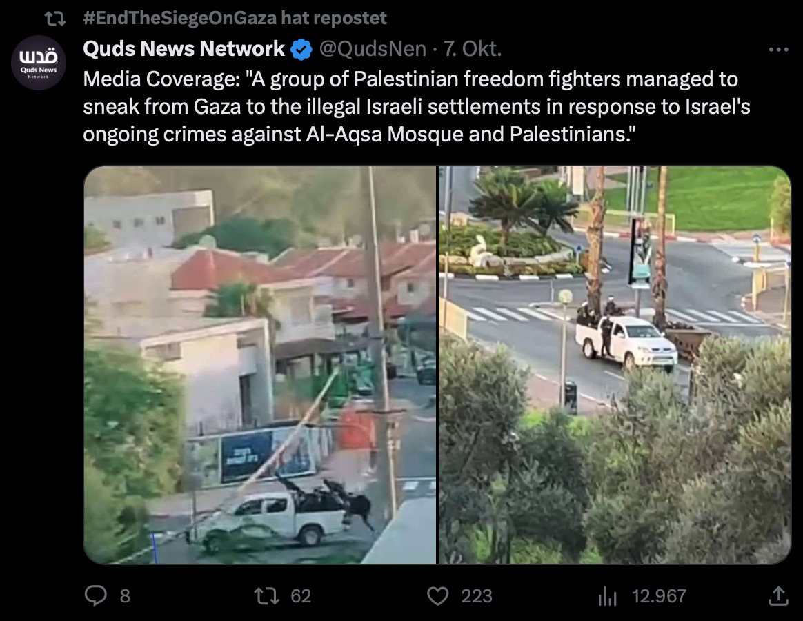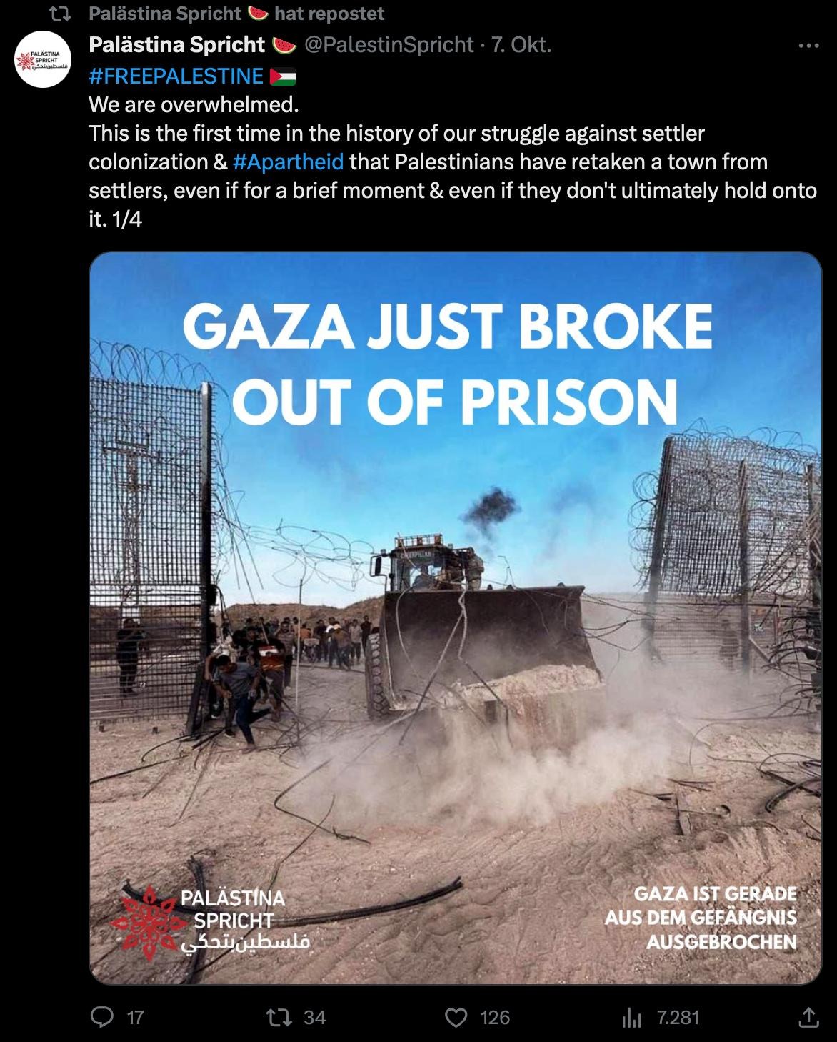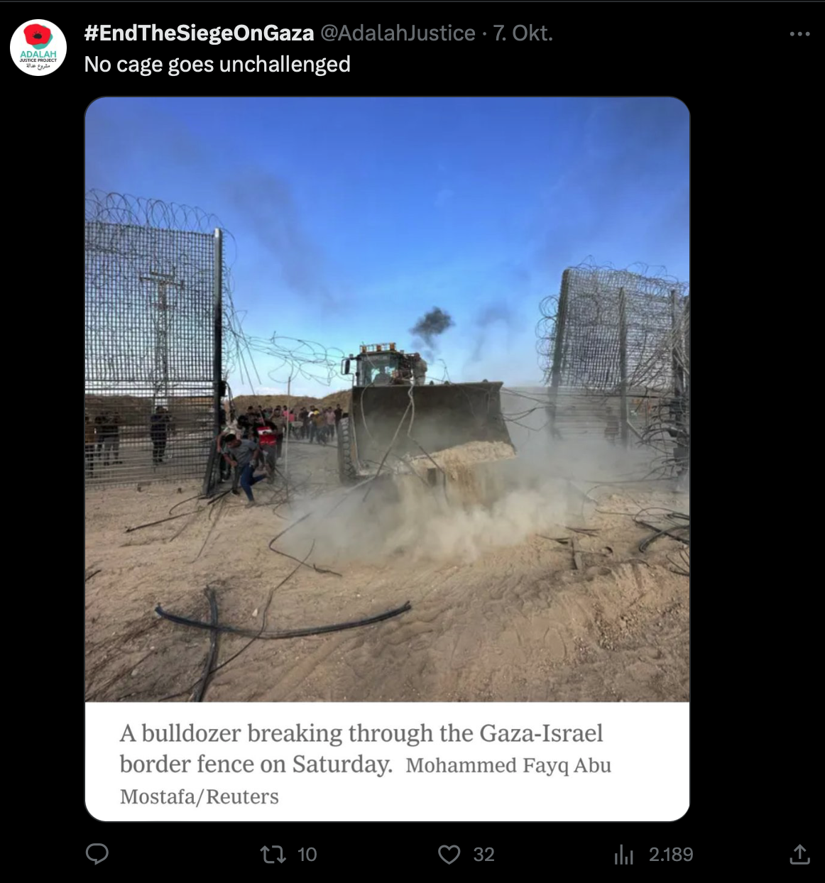 Der Account adalahjustice, den Greta Thunberg empfiehlt, teilt ebenfalls das Hamas-nahe „Quds News Network“, welches die Terroristen „Freiheitskämpfer“ nennt. Es wird auch das Durchbrechen der Grenzmauer gefeiert, was auf den ersten Blick unproblematisch wirkt. Wenn man völlig ausblendet, dass das Teil einer Operation war, so viele Zivilist*innen in Israel wie möglich zu töten.