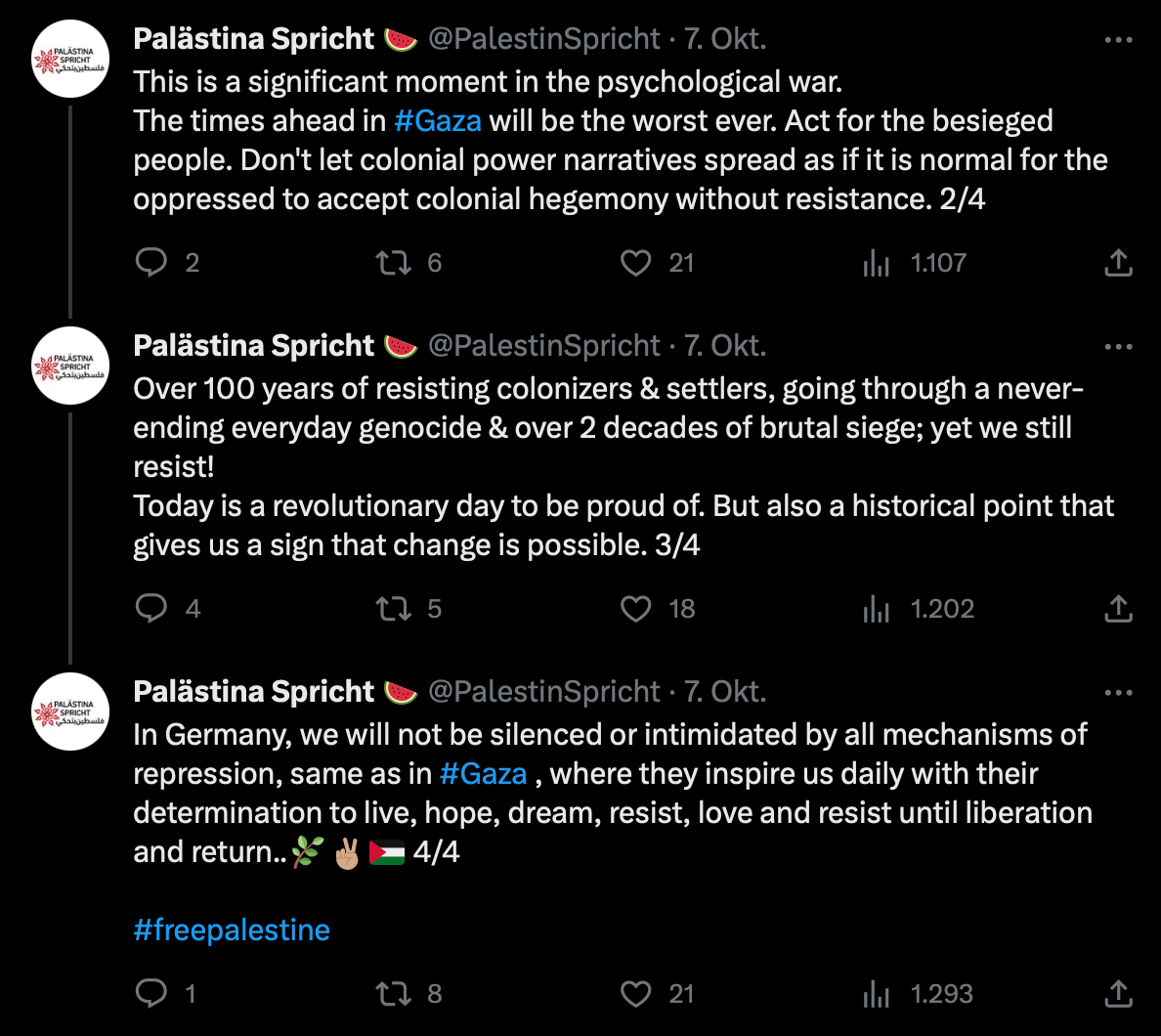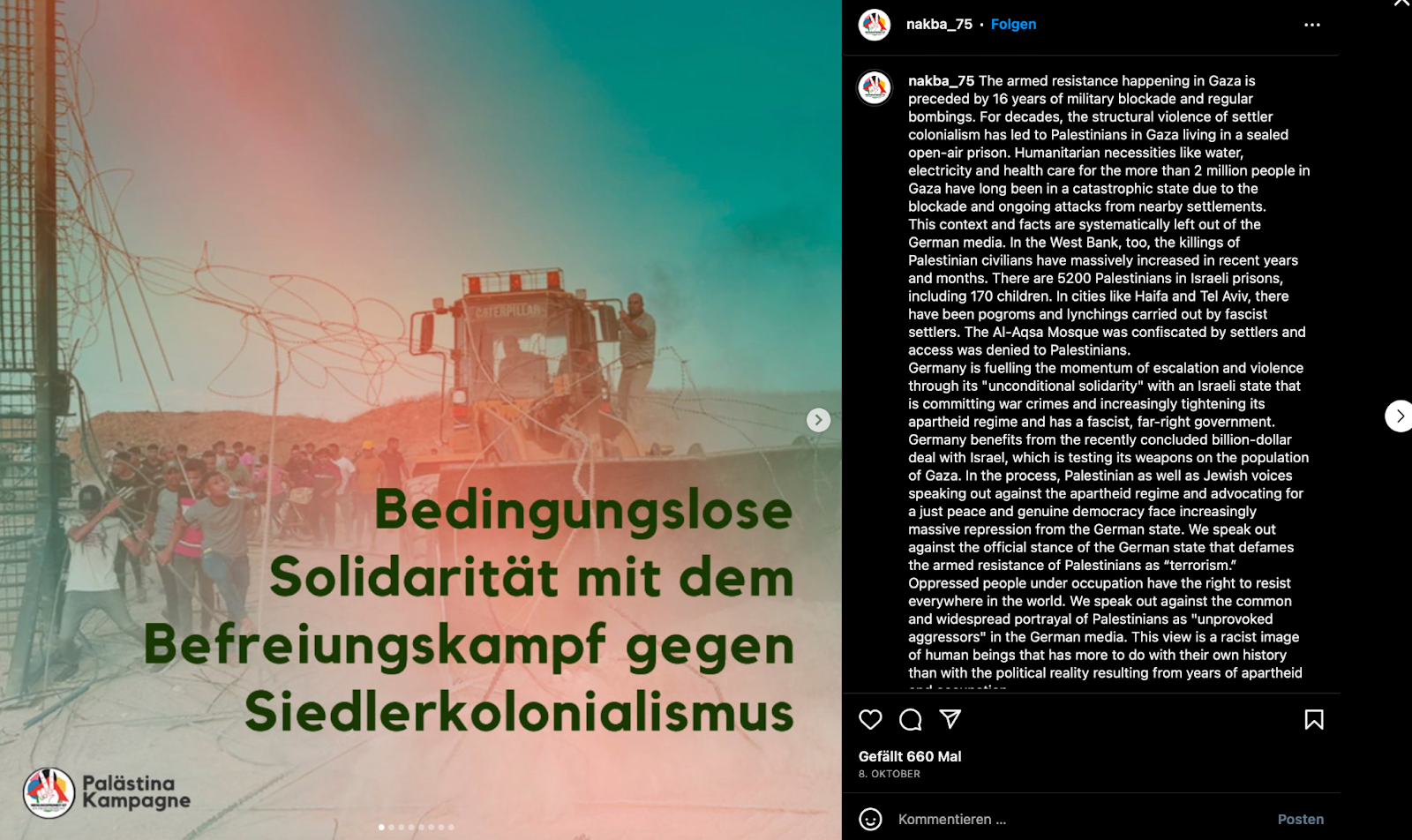 „We speak out against the official stance of the German state that defames the armed resistance of Palestinians as „terrorism.“ Oppressed people under occupation have the right to resist everywhere in the world.“