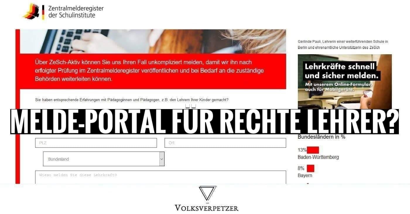 "Pünktlich zum Weltlehrertag am 05. Oktober 2018 hat heute das Zentralmelderegister der Schulinstitute als bundesweites Melderegister für demokratiegefährdende Pädagoginnen und Pädagogen den Betrieb aufgenommen. In der Trägerschaft der STAY BEHIND FOUNDATION bietet das ZeSch allen Schülerinnen und Schülern, aber auch ihren Eltern, die Möglichkeit zur Anzeige von Lehrkräften, die durch eine undemokratische Haltung ihren Lehr- und Bildungsauftrag verletzen.