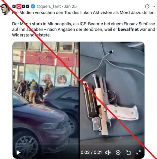 Im Artikel ignoriert Nius alle Videos und andere Evidenz, die zeigen, dass der Ermordete keine Waffe in der Hand hatte. Auch werden Falschaussagen über die Ermordung von Renee Good verbreitet. Die New York Times konnte mit Videos belegen, dass Good ihr Auto von den Agenten weggesteuert hat und der Agent neben dem Auto stand, als er Good erschoss. Nius dagegen deckt die Mörder.