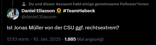 Ist der ÖRR-Blog, beziehungsweise der CSU-Mann, der ihn betreibt, etwa rechtsextrem? Das fragt sich der Politiker Daniel Eliasson von den Grünen aus Berlin. Jonas Müller ist der Gründer des ÖRR-Blogs, der sich selbst als „Kritischer Beobachter des deutschen Öffentlich-rechtlichen Rundfunks“ beschreibt.
