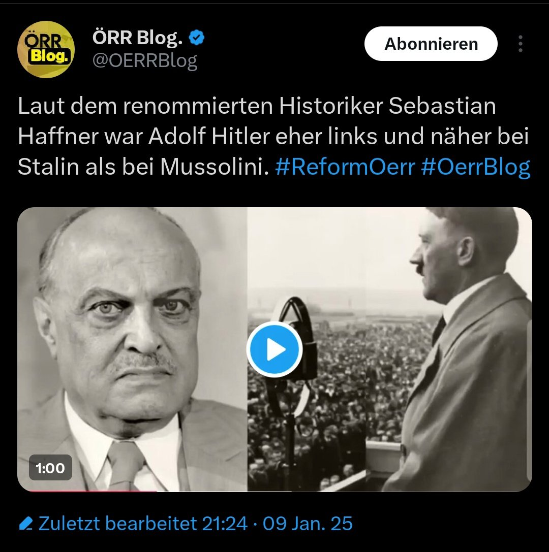 Am 9. Januar 2025 hat der ÖRR-Blog jedoch einen Ausschnitt eines Beitrags veröffentlicht, in dem der Journalist Sebastian Haffner über Adolf Hitler behauptet habe, dass dieser angeblich eher links und näher an Stalin wäre, als an Mussolini.