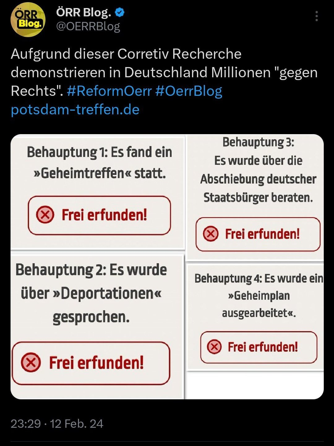 Am 12.02.2024 hat der ÖRR-Blog die Webseite potsdam-treffen.de geteilt, auf der das Treffen von CDU und AfD Politikern mit Rechtsextremen wie Martin Sellner und Mario Müller, das durch die Recherchen von Correctiv aufgedeckt wurde, relativiert wurde. Für die Webseite ist Gernot Mörig verantwortlich, der selber Teilnehmer des Treffens war und rechtsextremer Aktivist ist. Correctiv hatte aufgedeckt, dass dort unter anderem die AfD besprochen hatte, wie man Millionen Menschen, auch deutsche Staatsbürger, aus dem Land vertreibt. Trotz großer Propaganda und vieler Klagen, steht weiter fest, dass Correctiv Recht hatte. Auch gegen Volksverpetzer wurde erfolglos juristisch vorgegangen, weil es nun mal wahr ist. Auch Teilnehmer wie Sellner haben bestätigt, was „Remigration“ wirklich heißt. Wer so ein Treffen, mit den dort besprochenen, verfassungsfeindlichen Absichten, relativieren möchte, hat offenbar die Absicht, Rechtsextreme in Schutz zu nehmen. Und natürlich fehlt auch hier jeglicher Bezug zu Öffentlich-Rechtlichen.