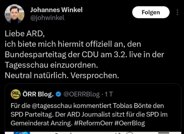 Der „ÖRR-Blog“ ist ein vorgeblich medienkritisches Projekt auf Twitter und Instagram, das den öffentlich-rechtlichen Rundfunk (ARD und ZDF) insbesondere wegen angeblich zu linker Berichterstattung angreift. Es wird von einem CSU-Lokalpolitiker betrieben, der sich für eine Reform des ÖRR starkmacht und dabei vor allem dessen Struktur, Finanzierung und vermeintliche politische Schlagseite kritisiert. Zwar erzielt der Blog beachtliche Reichweiten, doch mangelt es häufig an solider Argumentation und Transparenz: Beiträge werden oft aus dem Kontext gerissen, politische Hintergründe verschwiegen und Kritikpunkte verkürzt dargestellt. So steht das Projekt im Verdacht, eher eine politische Agenda zu verfolgen, als eine echte, unabhängige Medienkritik zu leisten.