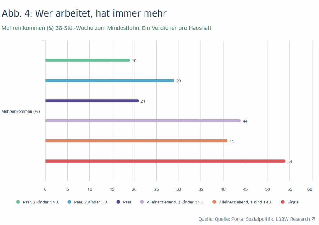 „Wer arbeitet, hat immer mehr“ – das gilt selbst für Geringverdiener. Trotz Einführung des Bürgergelds Anfang 2023 ist die Zahl der Übergänge in den Leistungsbezug nicht gestiegen. Diese Statistiken widerlegen auch den Mythos, dass Menschen mit niedrigen Gehältern einfach aufhören würden, zu arbeiten. Gleichzeitig hat die Anhebung des Mindestlohns (2022 auf 12 €) die Attraktivität von Arbeit weiter erhöht, da Erwerbstätige dadurch deutlich besser gestellt sind als Bürgergeldempfänger.