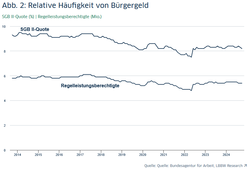 Im Gegenteil: Die Zahl der Bürgergeld-Empfänger ist in den letzten zehn Jahren sogar um deutlich mehr als eine Million zurückgegangen. Nach aktuellen Daten beziehen nur noch circa 5,5 Millionen Menschen in Deutschland Bürgergeld, was gut 8 % der Gesamtbevölkerung entspricht. Die Zahl der Leistungsempfänger war bis 2022 rückläufig; die Trendumkehr seither lässt sich ausschließlich auf Geflüchtete aus der Ukraine zurückführen.