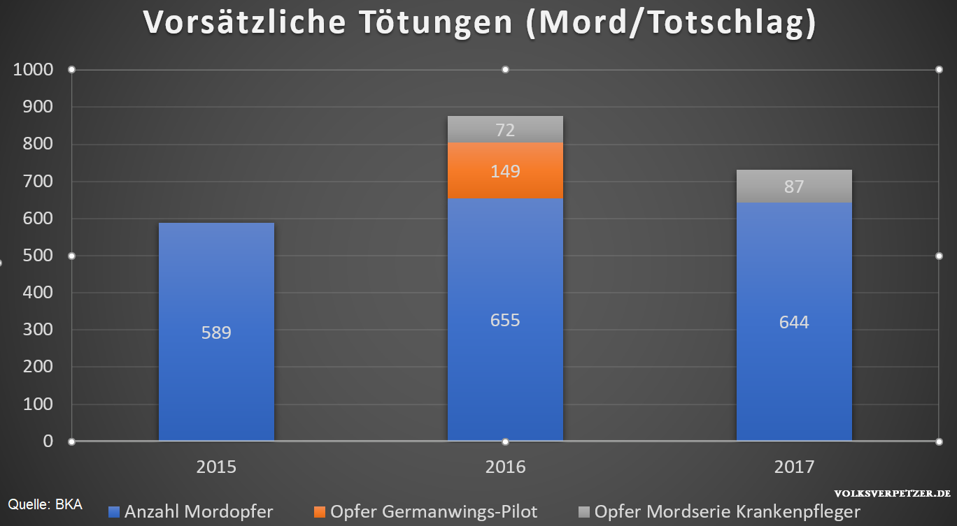 Nehmen wir die Jahre 2016 und 2017 als Beispiel, wie in einem vergangenen Volksverpetzer-Artikel erläutert. Laut offiziellen Statistiken der BKA aus den Jahren 2016 und 2017 war die Anzahl der Opfer vorsätzlicher Tötungen (Morde & Totschläge) dramatisch angestiegen im Vergleich zum Vorjahr. Das lag aber nicht an Schutzsuchenden, sondern an zwei deutschen Massenmördern.