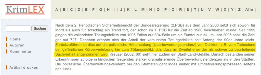 Das nur als kleiner Exkurs, damit du dir besser vorstellen kannst, wie verstärkte Kontrollen zu einer breiteren Aufdeckung des Dunkelfelds von Straftaten führen können. Aber zurück zur PKS. Die PKS spiegelt die Anzahl der ermittelten Straftaten wider, nicht die der tatsächlich eingegangenen. Denn es gehen nur die Straftaten in die PKS ein, die von der Polizei “ausermittelt” wurden und an die Staatsanwaltschaft abgegeben wurden. Wenn beispielsweise die Anzahl der Mordfälle in einem Jahr erhöht ist, müssen die Morde nicht unbedingt in diesem Jahr geschehen, sondern nur eben in diesem Jahr an die Staatsanwaltschaft abgegeben worden sein.