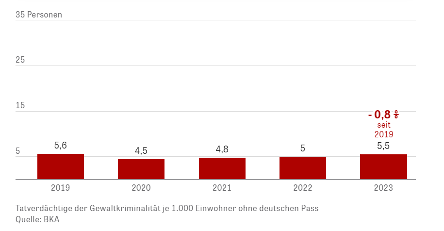 Dabei gibt es auch 2023, auch mit Fokus auf die Entwicklung in der Gewaltkriminalität, einen Grund zur Entwarnung, was Zuwanderung angeht, denn: Die Zahl ausländischer Tatverdächtiger von Gewaltverbrechen ist sogar leicht ZURÜCKgegangen, wie die ZEIT berechnet hat. In absoluten Zahlen gerechnet steigt die Zahl der ausländischen Tatverdächtigen von Gewaltverbrechen, in Relation zur Zuwanderung gesetzt ging sie jedoch zurück!