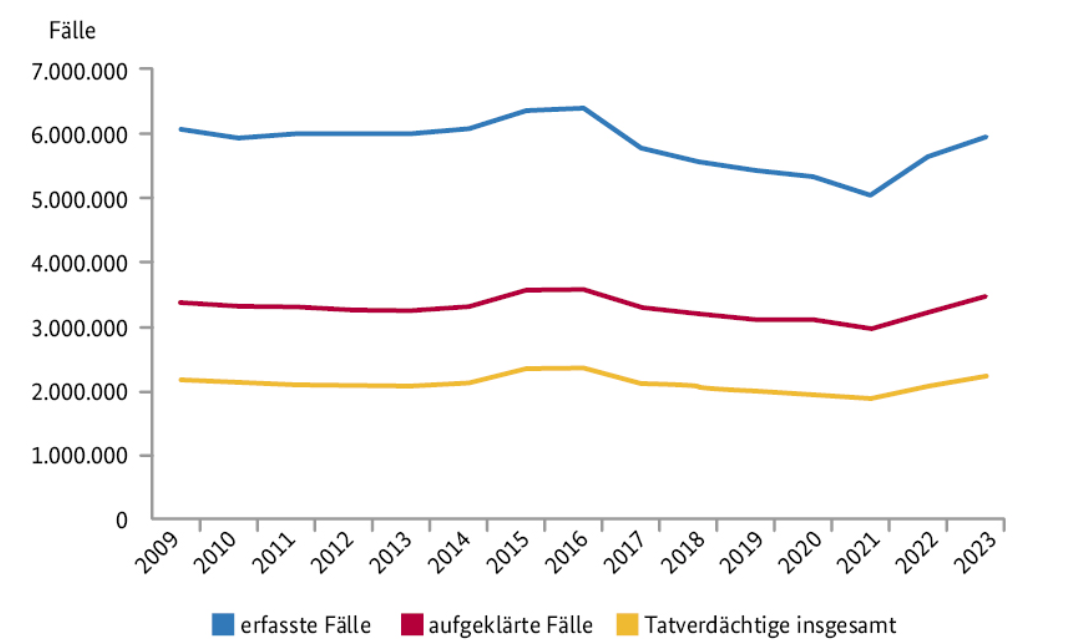 Vor 20 Jahren gab es viel mehr schwere Gewaltverbrechen als heute. 2023 gab es nach vielen Rekord-Jahren an gesunkener Kriminalität einen Anstieg, der überwiegend durch das Ende der Pandemie und die gestiegene Zahl an Menschen in Deutschland erklärbar ist. Proportional zur Wohnbevölkerung ist der Anteil von Kriminalität leicht gesunken über die Jahre.