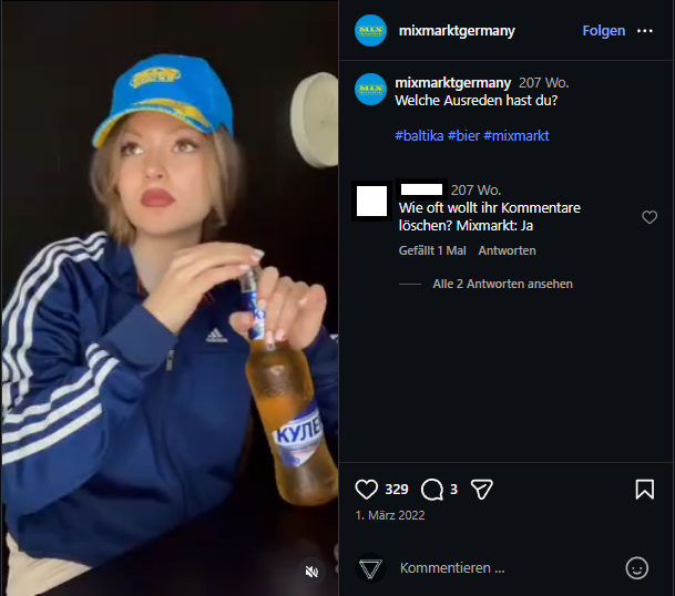 Anfang März 2022: Die Welt steht unter Schock. Seit knapp einer Woche rollen russische Panzer auf Kyjiw zu. Während globale Konzerne ihre Zelte in Moskau abbrechen, postet Mix Markt auf Instagram einen Werbe-Reel für „Baltika“. Es ist das Bier des gleichnamigen und eines des umsatzstärksten russischen Unternehmens. Für viele Follower:innen ein Schlag ins Gesicht. Doch Kritik wird im Keim erstickt. Kommentare, die darauf hinweisen, wie unpassend diese Werbung in Zeiten einer Vollinvasion ist, werden nach Recherchen des osTraum Journals gelöscht und als „Hass und Hetze“ bezeichnet.