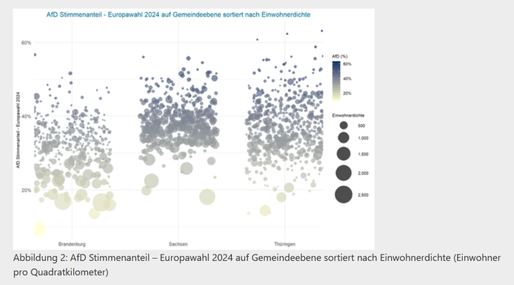 "Dort, wo die AfD stark ist, sind meistens ländliche Regionen, in denen nicht so viele Menschen wohnen. In den Kreisen, in denen mehr Menschen wohnen, wird mehr CDU oder SPD gewählt", sagt Siefken. Diesen Zusammenhang zeigt eine Abbildung der Forscher.