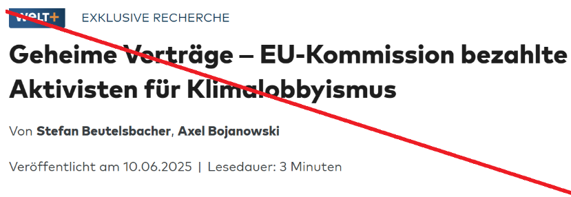 Mal von Anfang an: Die WELT hatte im Frühsommer 2025 behauptet, die EU-Kommission hätte in angeblichen "Geheimverträgen" Umweltverbände dafür bezahlt, Lobbyarbeit für den Klimaschutz zu betreiben, um Kohlekraft zu torpedieren und Handelsabkommen zu sabotieren. Eine Riesenstory, ein vermeintlicher Skandal. Nur: Die Geschichte war wie so oft bei WELT einfach dreiste Propaganda.