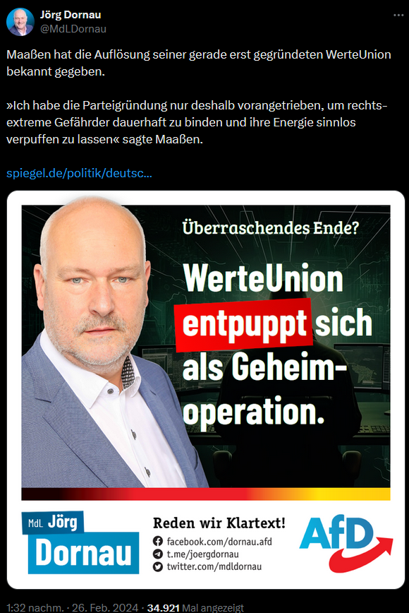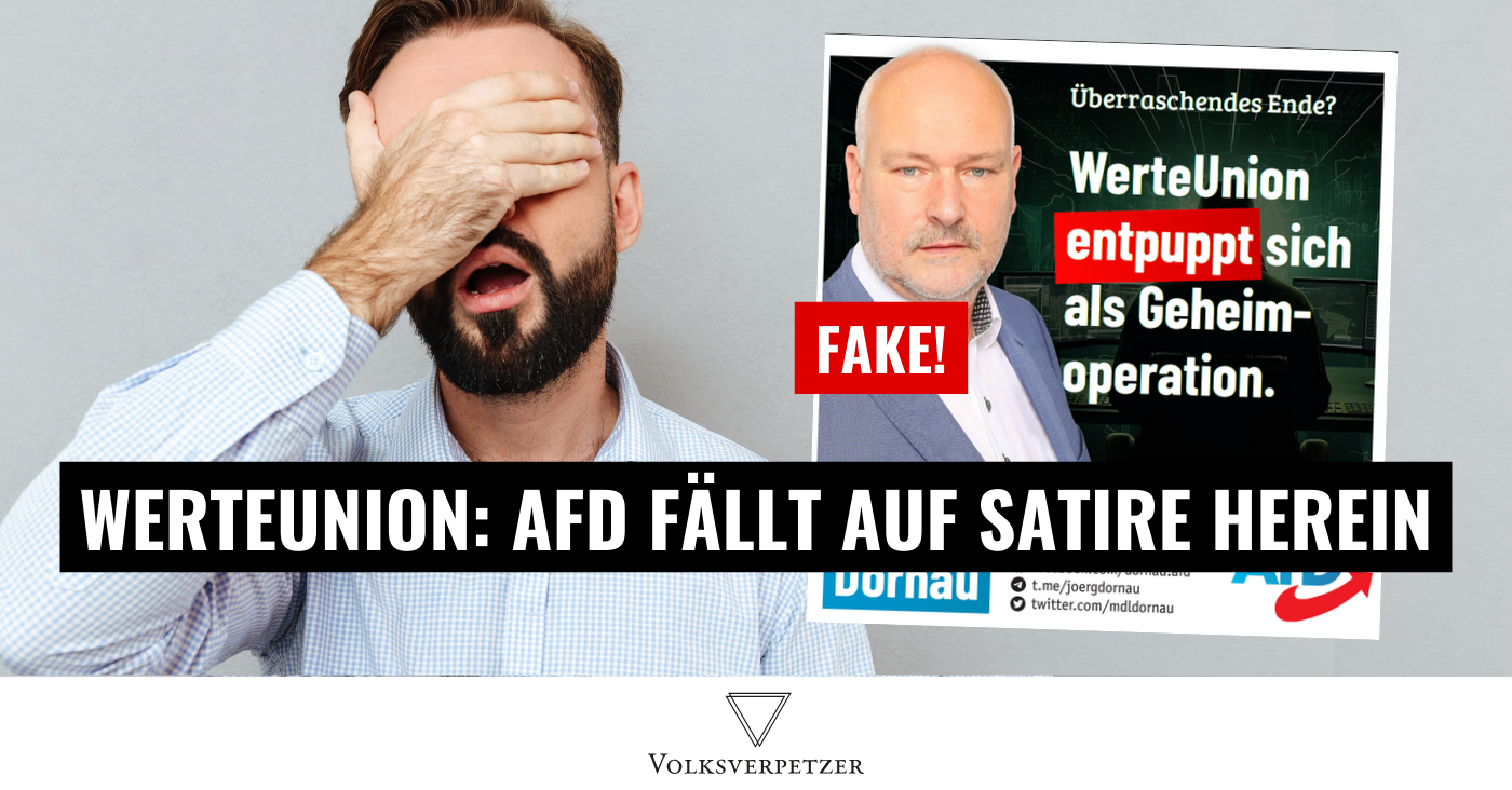 Der AfD-Rechtsextremist Jörg Donau, mit Landtagsmandat in Sachsen, scheint auf diese SPIEGEL-Satire hereingefallen zu sein. Die AfD Sachsen ist gesichert rechtsextrem und Dornau ist auch Mitglied des völkisch-nationalistischen Teils der AfD, dem auch Höcke angehört. In einem Tweet und in einem Facebook-Post zitierte er den Satire-Beitrag. Und präsentierte es gemeinsam mit einem eigenen Sharepic, als sei es eine Tatsache: „WerteUnion entpuppt sich als Geheimoperation“ behauptet er völlig wahrheitswidrig, ironischerweise mit einem Sharepic, auf dem er behauptet „Klartext“ zu reden.