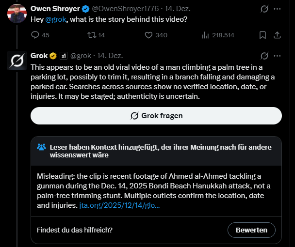 Okay, KI kann also Fake News in großem Stil verbreiten, aber kann sie auch helfen, indem man Chatbots fragt, ob etwas Fake ist? Tja, das hat leider bei der Bondi Beach Attacke vor allem dazu geführt, dass MEHR Fakes in Umlauf kamen.