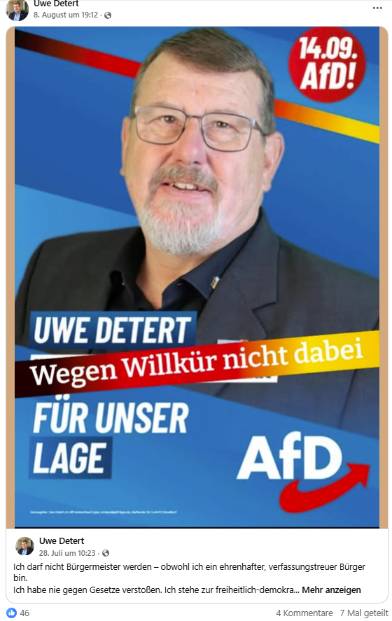 “AfD-Kandidat Uwe Detert soll in den vergangenen Jahren verfassungsfeindliche Inhalte im Internet weiterverbreitet haben, unter anderem auf Facebook. So soll Detert unter anderem antisemitische Verschwörungstheorien geteilt und die These weiterverbreitet haben, Deutschland sei kein souveräner Staat.”