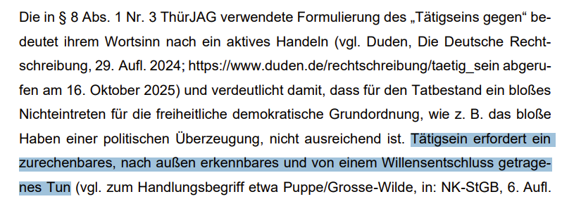 Dass es auch anders geht, zeigt der Thüringer Verfassungsgerichtshof. Dieser verwarf Ende November eine AfD-Klage. Die AfD wollte erreichen, dass Nachwuchsjurist:innen nicht mehr der Zugang zum Rechtsreferendariat verweigert werden kann, auch wenn sie gegen die freiheitlich-demokratische Grundordnung verstoßen. Thüringen erteilte dem entsprechenden Antrag nun eine Abfuhr und machte deutlich, dass es schon vor strafbarem Verhalten möglich ist, verfassungsfeindliche Bewerber:innen auszuschließen. Gemäß der Argumentation des Thüringer Verfassungsgerichtshofs ist zwar eine AfD-Mitgliedschaft allein noch kein Grund, jemanden vom Referendariat auszuschließen. Die Handlungen gegen die freiheitlich-demokratische Grundordnung müssten von Gewicht sein und im Einzelfall entschieden werden.